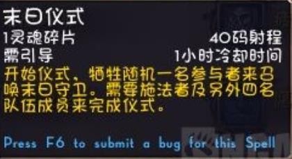 末日仪式是一个术士的特殊技能,技能CD—小时。召唤出的一个祭坛,随时都可以释放,你需要四个队友帮助你点击这个祭坛。然后五个人之中会随机死—个人,召唤出一个末日守卫。