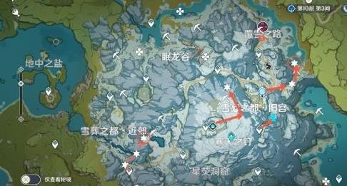 线路图:箭头表示路径,红圈表示在雪堆下的冰晶蝶,六角星表示刷新点。