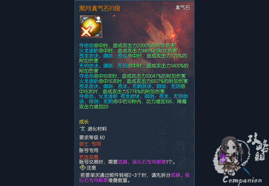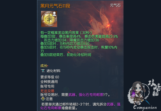 黑月武器、元气石、真气石作为南天版本的装备,其属性较上一版本雪峰武器、元气石、真气石有了更进一步的提升。黑月装备11段的白字和绿字属性均比雪峰装备15段的属性高。