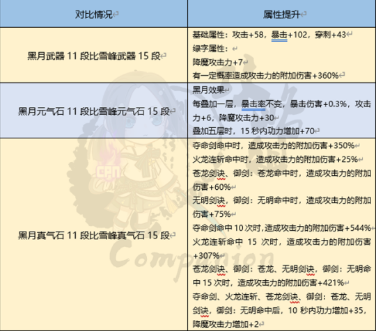 黑月武器、元气石、真气石11段与雪峰武器、元气石、真气石15段属性提升情况对比如下表(真气石以剑士为例):