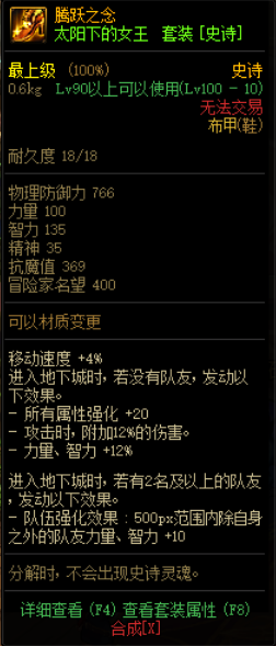 鞋子单刷增加20属强,12%的白字附加和12%的力智;组队增加10点力智。