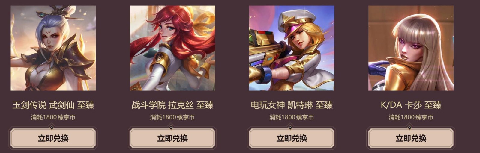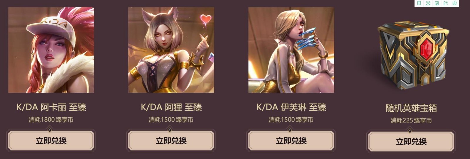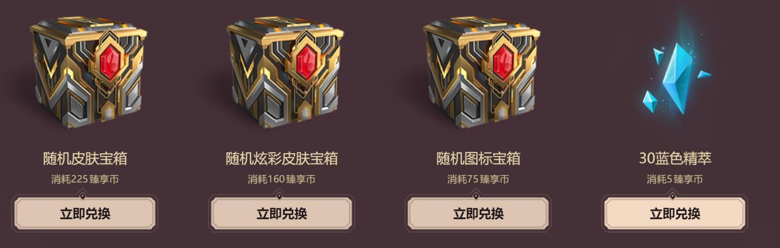 LOL游戏中,玩家开启宝箱可获得臻享币,臻享币可兑换K/DA至臻皮肤,随机英雄宝箱,随机皮肤宝箱等丰厚奖励,比如:K/DA卡莎至臻需要1800臻享币,随机英雄宝箱需要225臻享币,30蓝色精萃需要5臻享币。