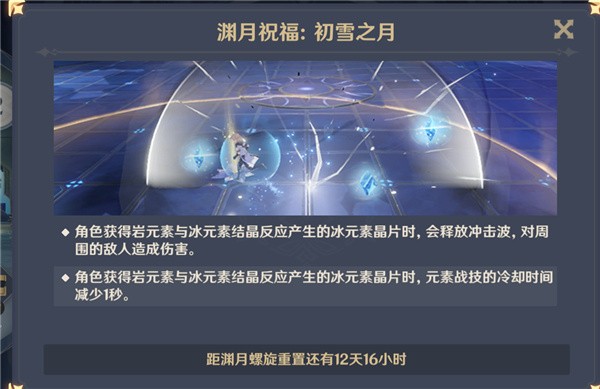 在游戏原神中,深境螺旋这半个月的BUFF是初雪之月,初雪之月的具体效果为当我们获得冰元素与岩元素结晶时,会释放冲击波对周围的敌人造成伤害,同时在获得的时候,角色的元素战技,也就是小技能会冷却时间减少1秒。