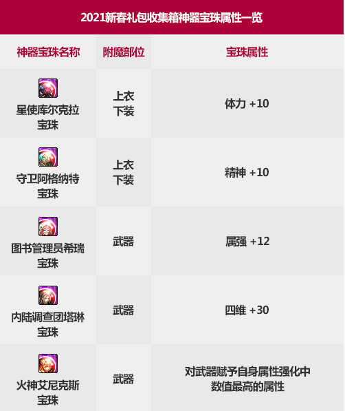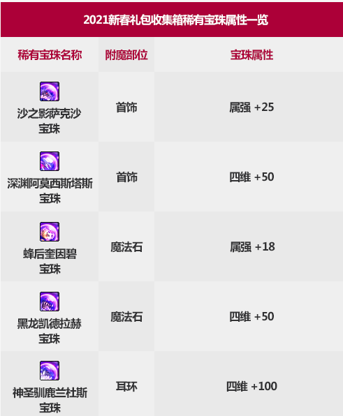 每放入一个不同类型的新春神器宝珠,可增加2点属性强化、10点四维