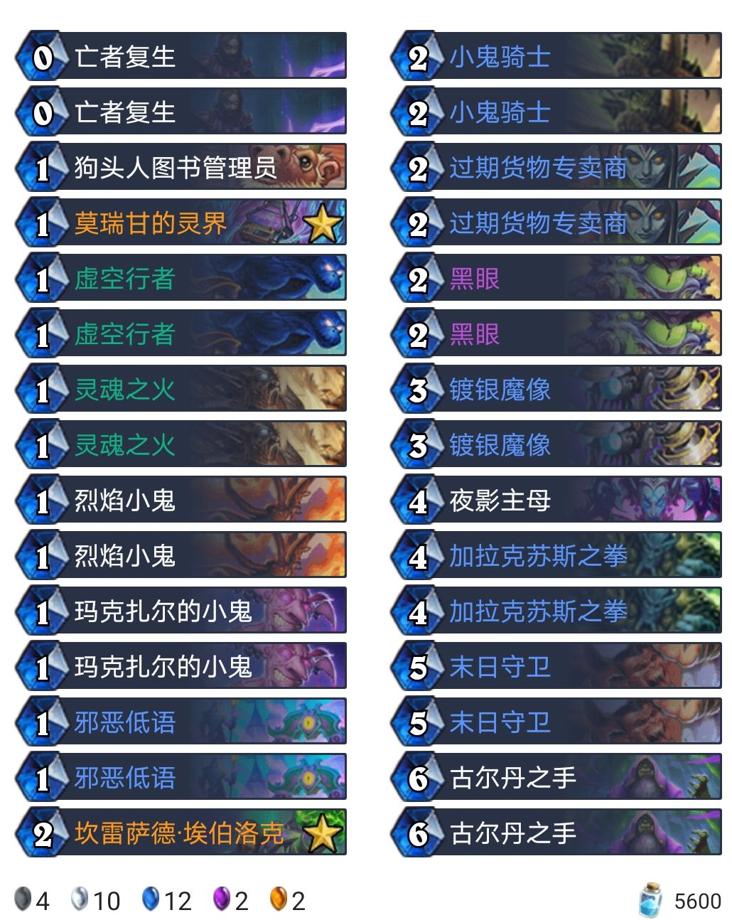 同黑眼术一样带上了黑眼作为前期的超展开能力,同时双玛克扎尔的小鬼可以迅速过牌,提高卡组的流畅性。没有携带高阶祭司耶克里克和萨瓦斯女王作为无限的弃牌手段,而是以短期收益为主,寻求迅速堆砌场攻伺机斩杀。