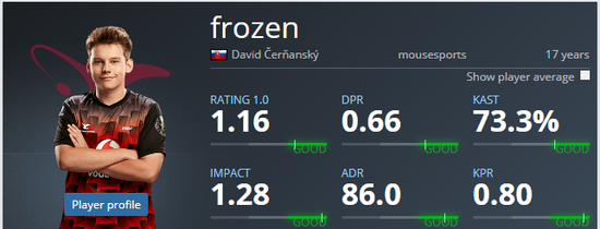 年轻是他的优势,同样也是他的劣势。难以适应T1赛事的节奏,赛场上心态的微妙变化,成为了他难以稳定发挥的短板。从近几场赛事的数据表现来看,frozen已经逐渐适应并能在比赛关键时刻站出来,拯救队伍赢得胜利。在不久的将来,以mousesports二老带三新的体系中,frozen能得到很快得提升,成为队伍最强的火力点。