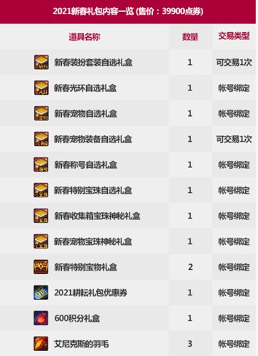 第一档:2021新春永恒的探索礼包,售价39900点券,包含以下内容: