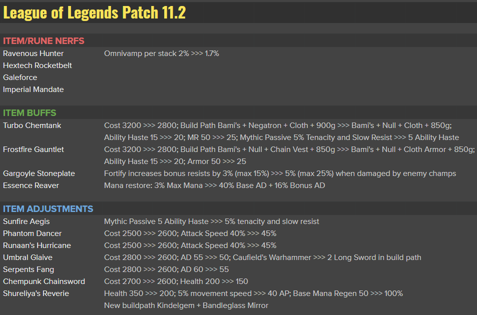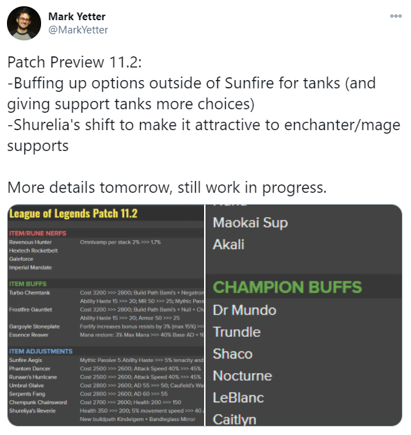 今日,设计师Mark Yetter发推公布了11.2版本的改动大纲。主要涉及了装备的调整,增强了日炎圣盾以外的坦克神话装备,给予坦克型英雄更多选择。