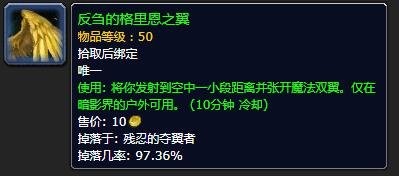 反刍的格里恩之翼由晋升堡垒稀有残忍的夺翼者掉落,玩家可以使用该道具在暗影界的户外空中飞行较短的时间。玩家使用该道具,可以轻松前往以前到达不了的地区,解锁全新的道具,简直就是野外发掘宝藏必备的玩具。