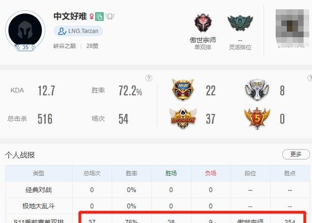 在前两年,韩服的rank当中可是有很多的路人王。他们自身实力强大,在排位赛里面疯狂carry,上个韩服千分就像喝水一样简单无比。在这里就不得不提到tarzan这位选手了。在s9的时候,泰山在韩服一共有三个账号,分数加起来高达4000+,其中大号1700+的分数更是打破了韩服记录,由此可见,这位选手的超强实力了。Tarzan到底有多猛?峡谷之巅75%胜率上大师,MVP次数多到咋舌!
