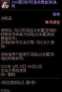 游戏《DNF》中,2018夏日称号使用后,可以将[探险记专属]深海的呼唤称号转换为[探险记专属]竞技舞者称号。获得的称号无法交易,可以永久使用。该转换券只能用于[探险记专属]深海的呼唤称号。
