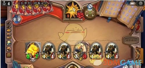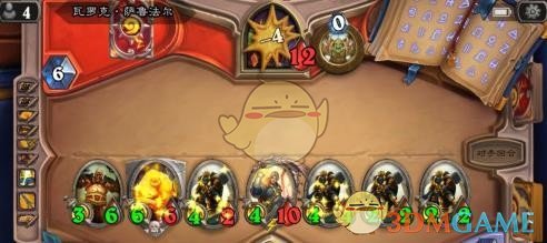 技能是0费使友方随从加三攻击力,我们的技能升级为两费召两个小兵,起手低费,把自己当超生骑打就行了,用好军需官一波优势就基本通关了。图拉扬留着给对面大怪。