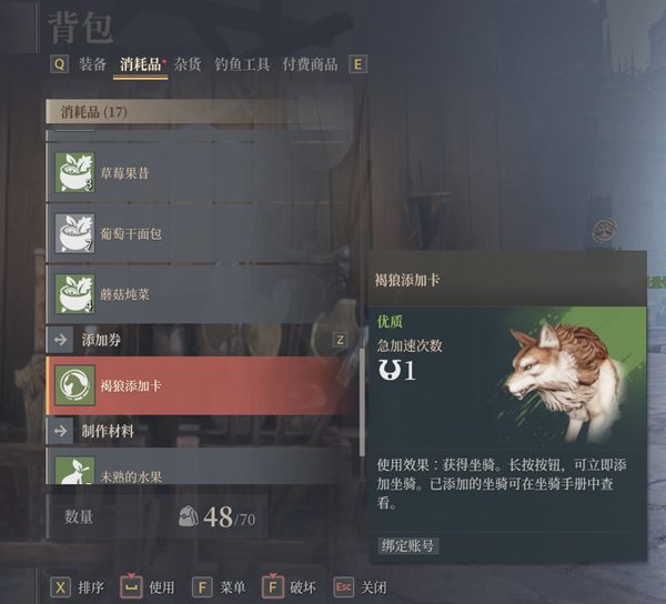 1. 进入菜单 > 背包 > 消耗品,查看获得的坐骑卡。