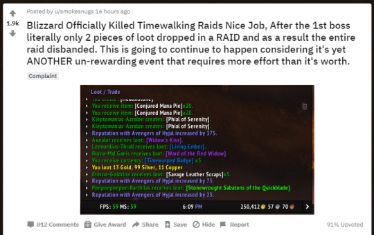 有外服玩家在Reddit上发帖,称第一天组建的时光漫游团本只打了一个Boss就解散了,原因就是20人的团居然只掉了2件装备!而火焰之地整个副本也就7个Boss,这意味着打完全部人均还拿不到一件装备!这种令人十分不爽的体验自然是引发了连锁效应,结果就是大家都认为不值得去做这个事情,团队就散伙了。