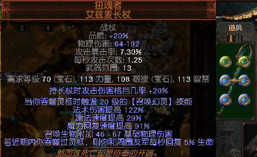 武器:扭魂者-艾兹麦长杖(可以转伤,也可以走物理穿刺,我走的转冰伤,4蓝2绿最佳搭配,洗不出来的可以4蓝1红1绿)