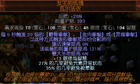 衣服:多种选择,看自己喜好决定,可以是兽腹,可以是鸟衣,可以是白袍,可以是黄装,唯一要求是6连,我用的是这件瓦尔法衣-女王的饥饿: