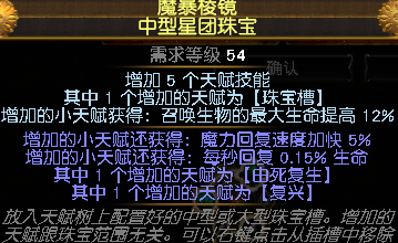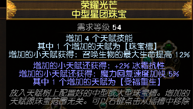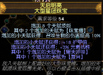 珠宝:大型星团带屠夫呼唤和复兴,中型星团其中一个带有受福重生(必须),另外一条复兴,第二个中型可以带由死复生+复兴,蓝色的那个带范围的珠宝叫真知灼见-钴蓝珠宝加生命的,其他的珠宝孔大家可以放召唤伤害珠宝,也可以放血量加抗性珠宝很灵活,我发下我的组合: