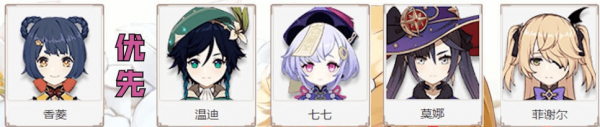 香菱、温迪/砂糖、七七/重云、莫娜/行秋、菲谢尔/丽莎