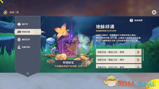 地脉移涌活动,在该活动期间玩家每天可以获得三次双倍地脉奖励,这个活动大家一定不要错过哦,毕竟目前游戏中的树脂是在是太少了,资源也十分紧张。