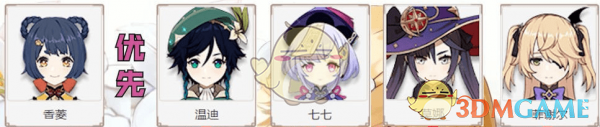 香菱、温迪/砂糖、七七/重云、莫娜/行秋、菲谢尔/丽莎