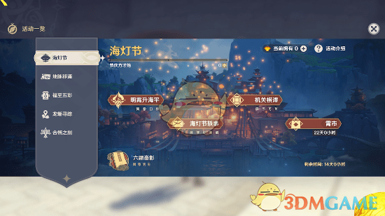 海灯节基于“节庆热度”分为三个阶段:分别是“节庆方才始”、“众客云集来”、“万家霄灯光”。旅行者需要通过完成“海灯节轶事”中璃月居民的各色请求,提升“节庆热度”,并解锁下一阶段的剧情。