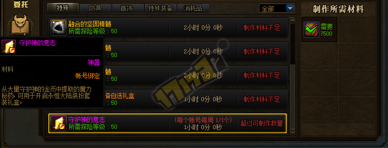 50级后,每个账号每周可以制作1次守护神的意志,1次会给2个守护神的意志。