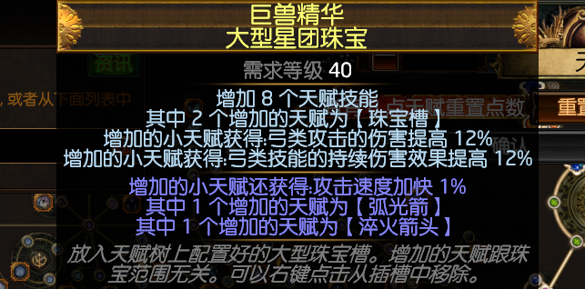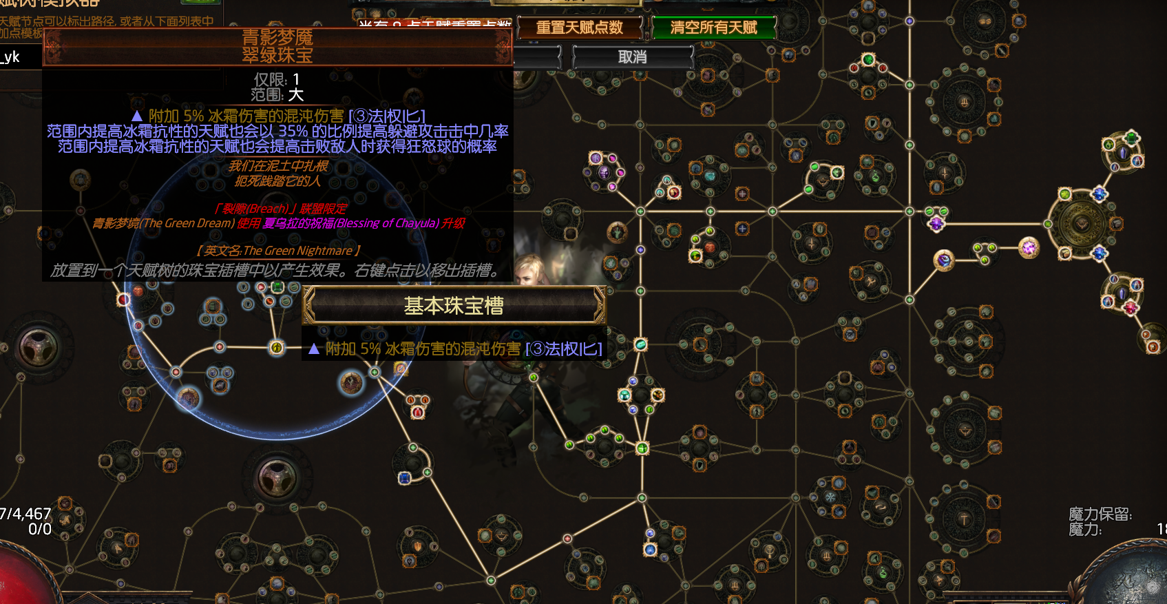 小型星团珠宝:持久冷静。其他小珠宝用的是补力量 血量和混沌持续伤害加成以及地雷伤害都行