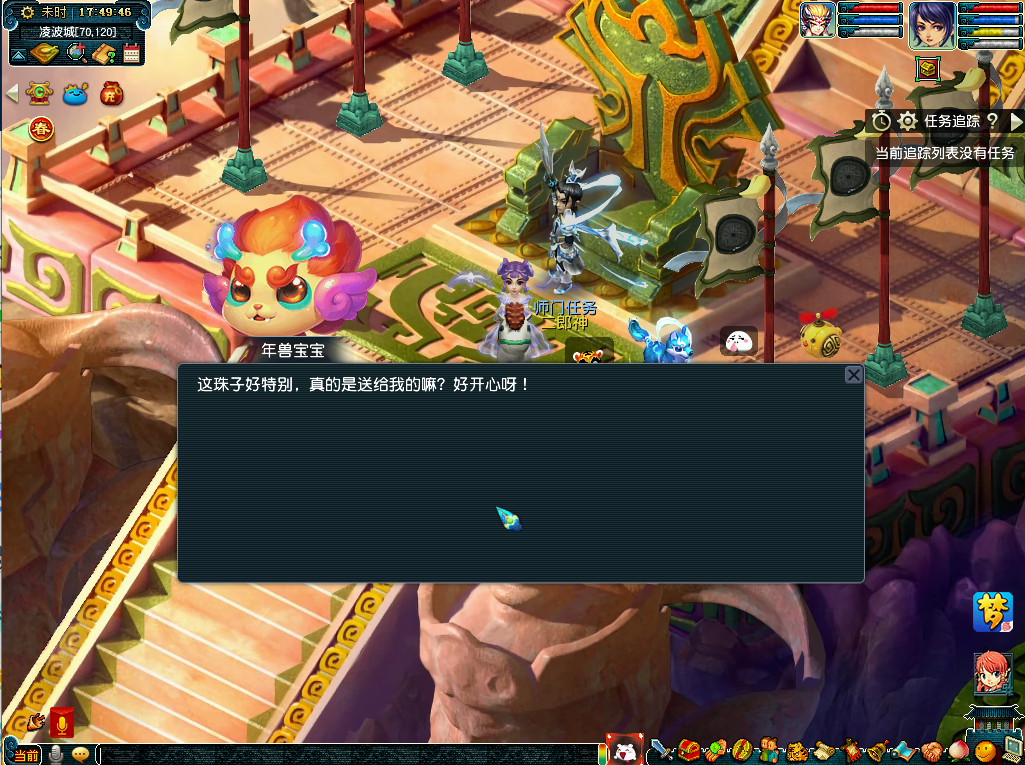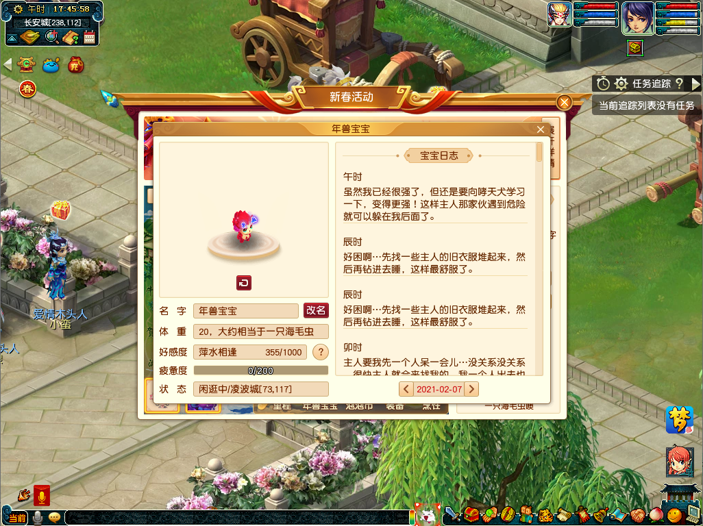 2、年兽宝宝会在整个春节期间陪伴少侠,即使少侠不在线,也会在世界中闲逛。年兽宝宝会在春节结束时与少侠离别,去寻找彻底解除石化的方法。