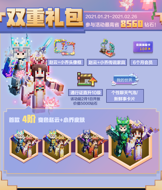 双重礼包:首款多重特效4阶变色赵云及小乔皮肤、赵云及小乔头像框、赵云及小乔传说家具、6个月会员、通行证直升10级、聊天及新鲜事/个人中心卡片背景。