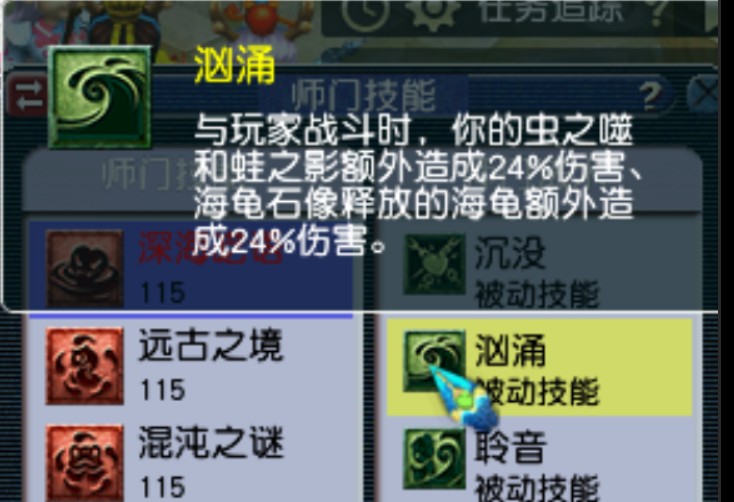 被动2汹涌:与玩家战斗时,你的虫之嗤和蛙之影额外造成24%伤害、海龟石像释放的海龟额外造成24%伤害。