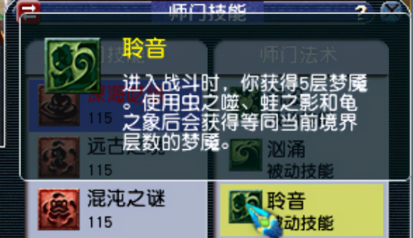 被动3聆音:进入战斗时,你获得5层梦魇。使用虫、蛙、龟技能后会获得等同当前境界层数的梦魇。