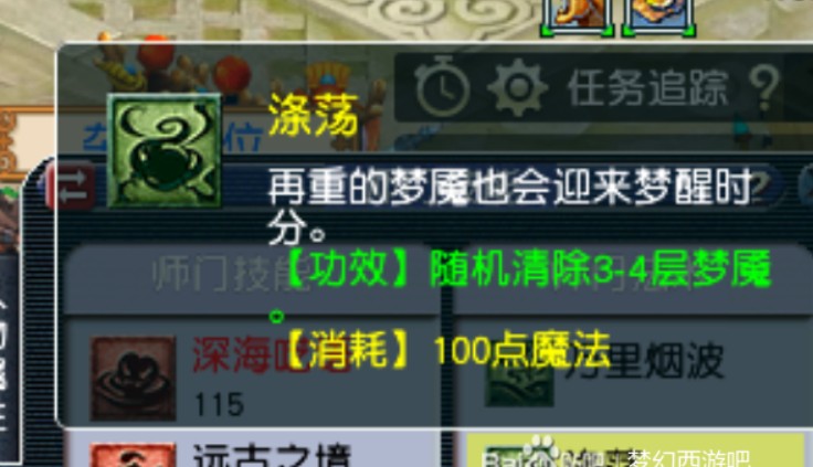 包含3个技能,主动技能1万里烟波:退出当前的境界,有概率清除全部梦魇。
