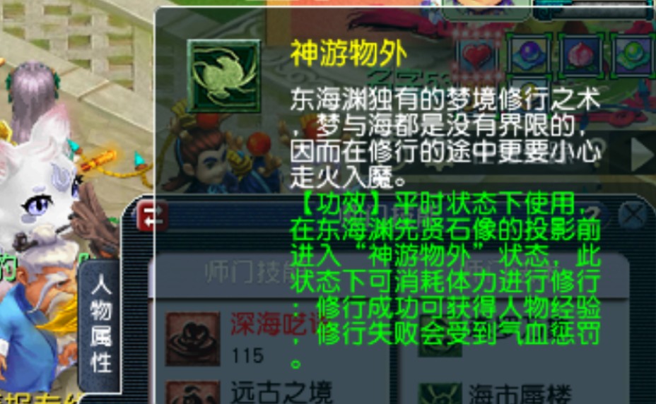 主动技能3神游外物:在东海渊先贤石像前使用技能,可进入“神游外物”状态,消耗体力进行修行,成功获得经验,失败受到气血惩罚。