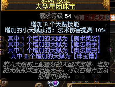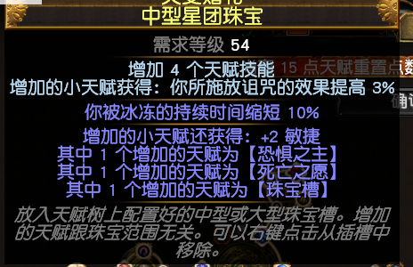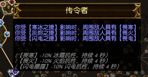 很多萌新在这赛季元素改版之后都在问元素曝露怎么弄,其实这根本就是翻译的锅,畏火就是火焰曝露,同时定罪波也是属于元素曝露。这个珠宝完美配合贵族元素使的升华,畏火额外减25%抗性,同时元素使可以强制感电10%增伤,所以用毁灭使徒加了10%感电几率,不然必须要暴击才能感电,这BD打单体要暴击有点难。