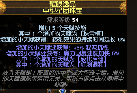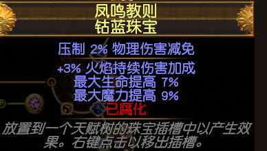 这样生命魔力和火焰持续伤害加成的珠宝3颗,注意本BD不需要任何火焰伤,燃烧伤害等等INC伤害加成,有尿布头在的情况再堆INC伤只是在浪费词缀,只需要在装备上找持续伤害加成。