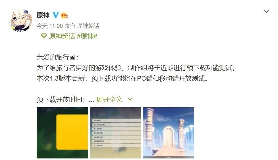 米哈游开放世界动作RPG大作《原神》官方微博今日(1月29日)宣布,将于近期进行预先下载功能测试,PC版及手机版玩家将能预先下载本次1.3版本更新。