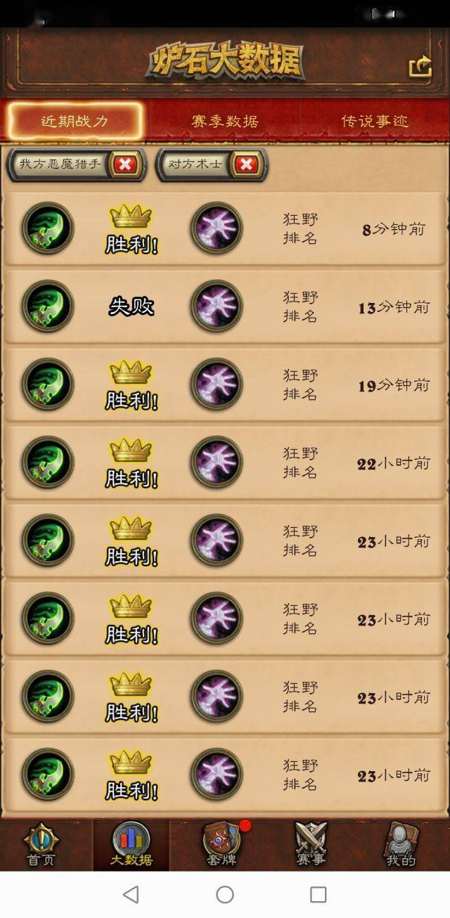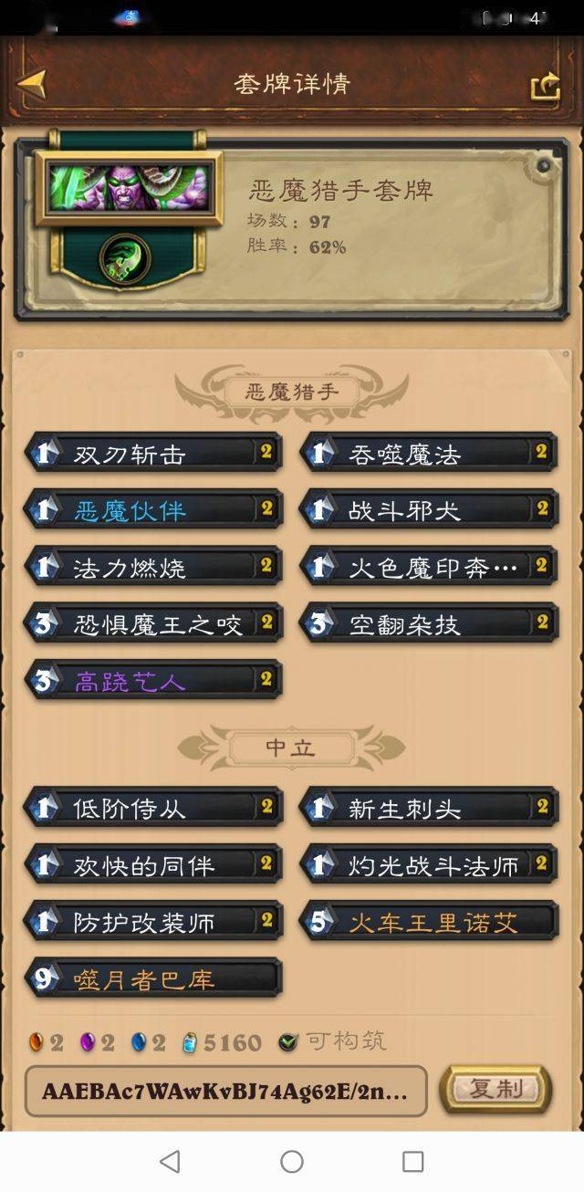 这套瞎子有28张卡都在3费以下,但是伤害和续航非常足,经常到七八费十几点爆发打出去。现在狂野暗金教三家数量众多,这套卡组打全形态术士胜率均可以达64到82开,我10星从0开打,胜率大概如下: