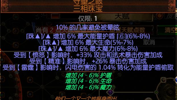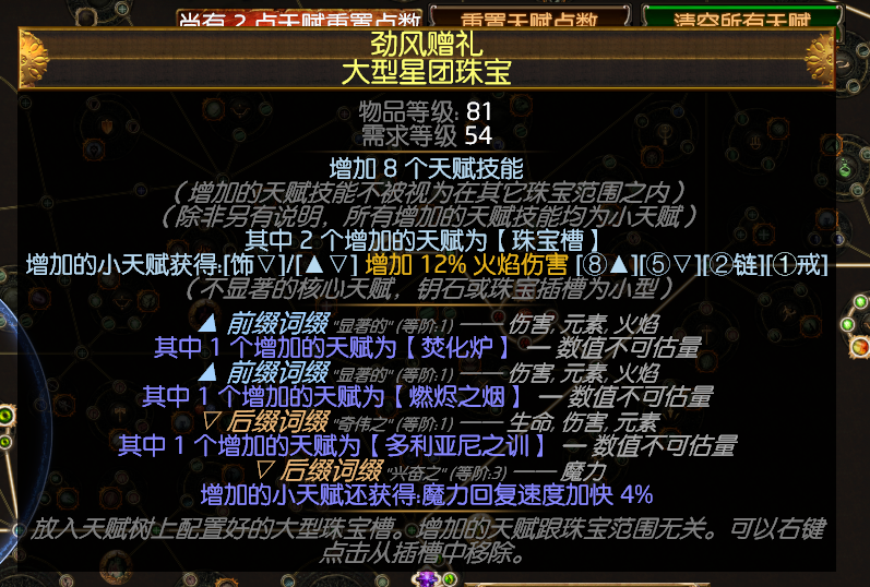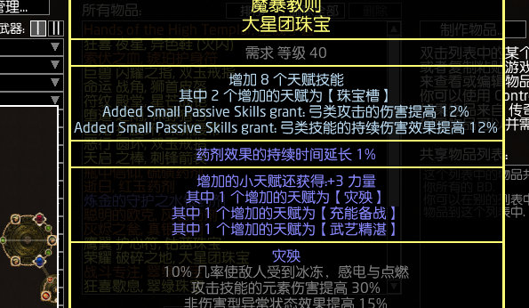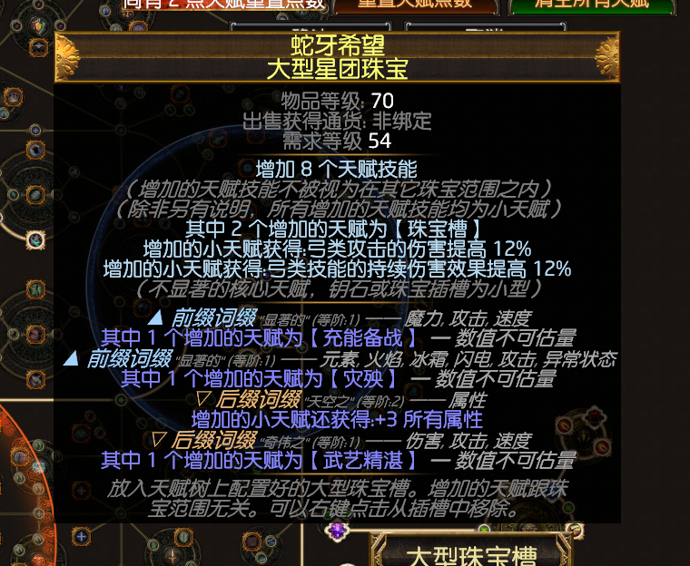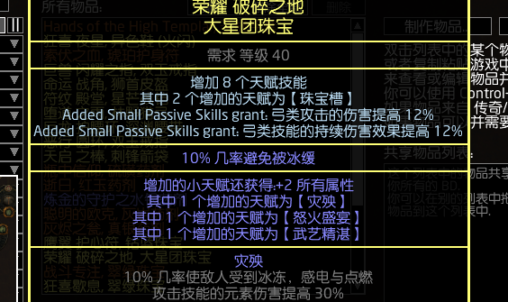 星团珠宝的话,这两颗。现在大佬们都换成双弓底子的珠宝,跑了一下pob发现火焰和弓的dps差的不是很多,可能因为手感比较好所以大佬换了双弓吧。也放出来给大家看看