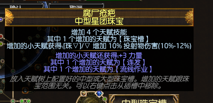 还有一颗中型,我和大佬用的都是这颗,也有别的大佬选择暴击的那颗中星团,不缺暴击的情况下选投射物,缺暴击应该还是用暴击比较好。