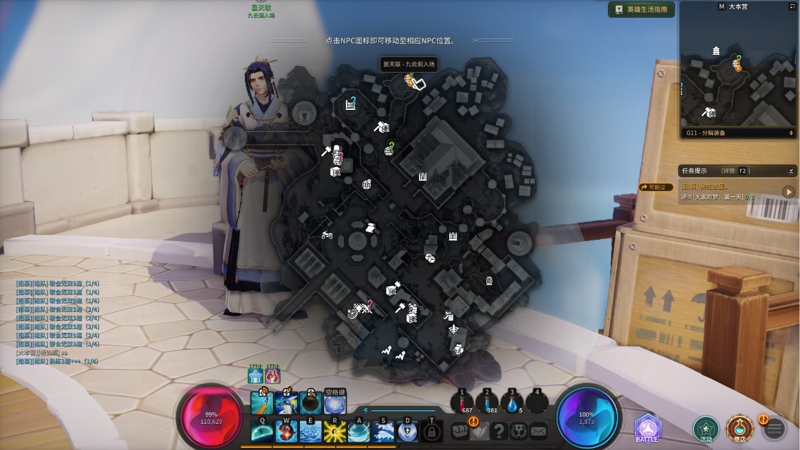 玩家也可以在左上的小地图下方点出NPC的下拉目录,找到“昙天联-进入九云洞”点击后可直接导航寻路。