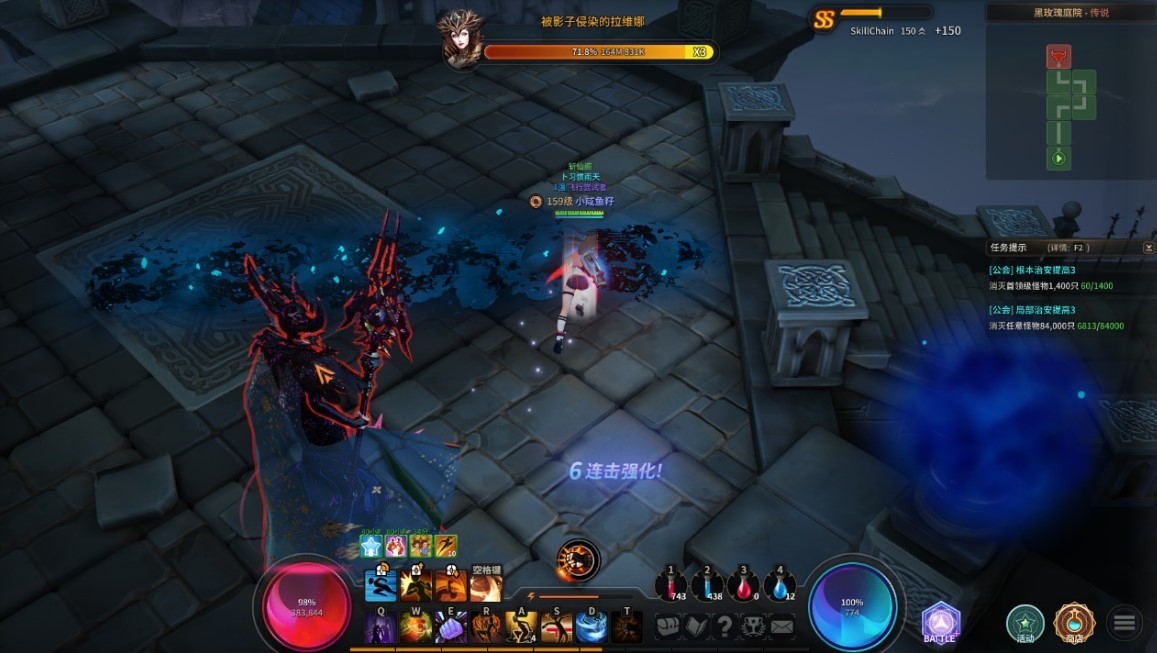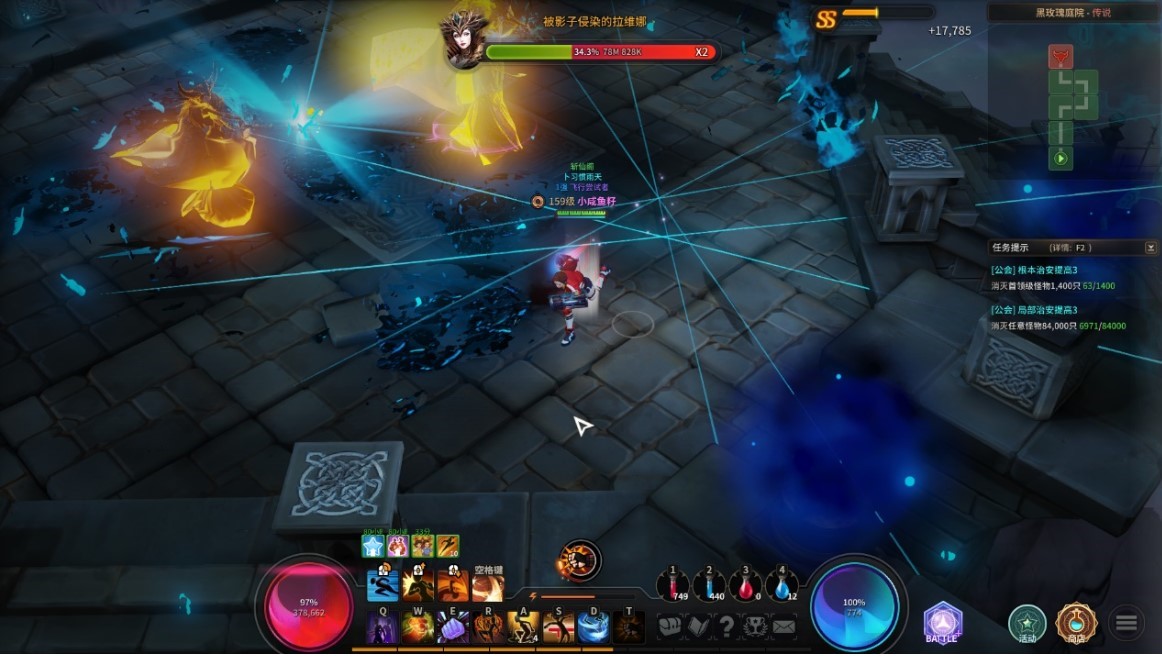第四个技能是分身。BOSS自身血量被削减到一定程度时使用,召唤出一个分身拉维娜。分身也能释放前三种技能,建议尽快击杀分身,不然技能太密集,非常不好躲。
