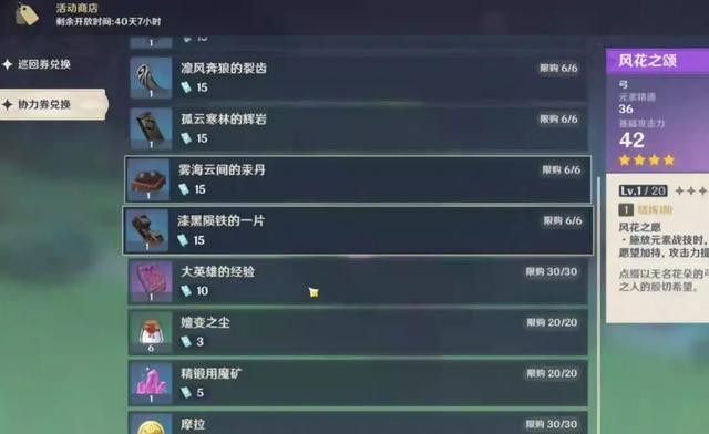 这次的风花节活动商店中也加入了大量道具,玩家可以兑换经验书、武器突破素材、魔矿、摩拉等等。最重要的是通过风花节活动玩家可以免费获得一把四星武器弓,这把弓叫做风花之颂,主属性元素精通36,基础攻击力42,副属性,在释放元素战技时增加16%攻击力,时间持续5秒。如果属性没有修改的话,感觉这把武器给公子打速却还是不错的。