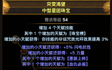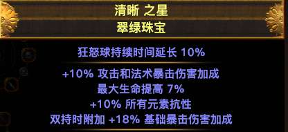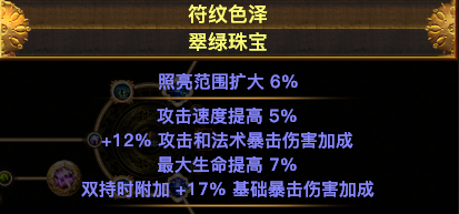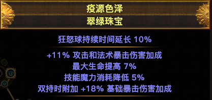 主要说一下这个珠宝,尽量找到2个,技能魔力消耗降低5%的。这样可以省下一个暗金珠宝的位置,就可以多生命和爆伤。