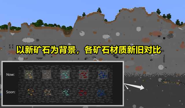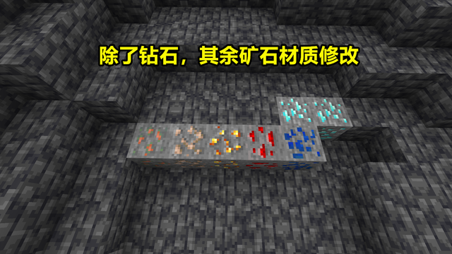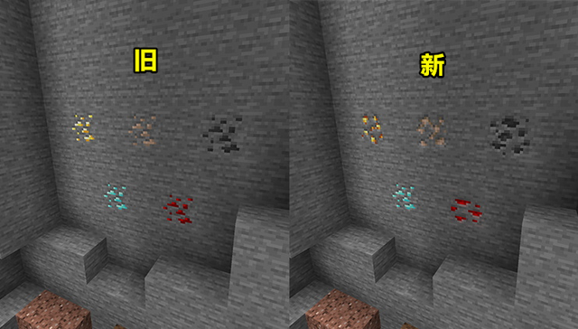 除了矿石的生成分布进行了修改之外,矿石的材质也发生了变化,除了钻石。Mojang此举也是对于矿石的一个完善,毕竟在此前的版本中只有钻石有独立的材质,而现在所有矿石都有独立材质了。