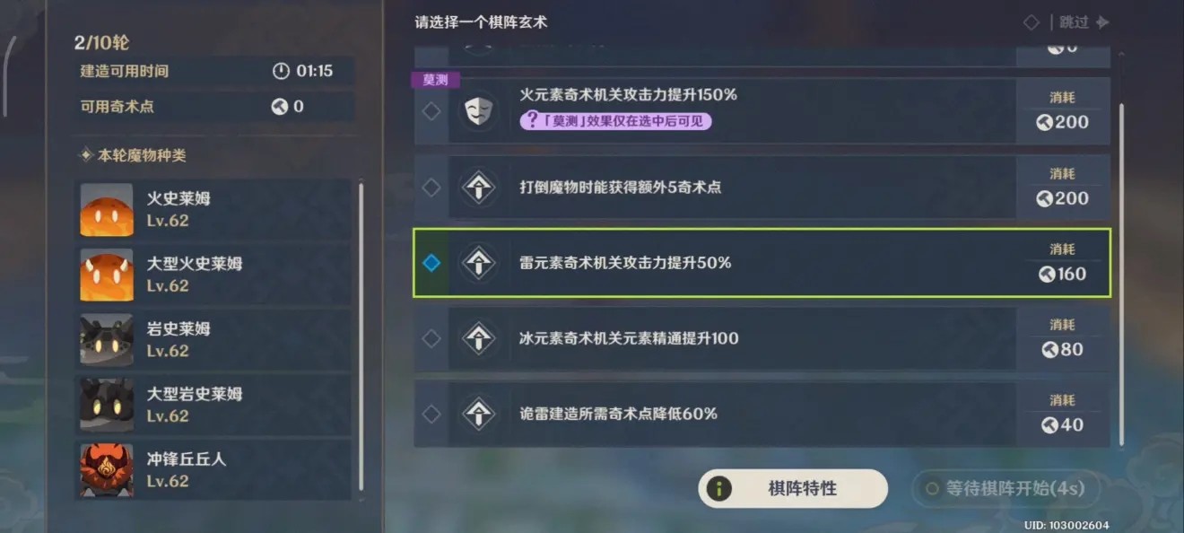 机关棋谭的特殊模式有一个很明显的特点,除了第一关之外,基本上没有木盾丘丘人和岩盾丘丘人,所以我们可以选择全雷柱的打法。这里就要介绍一下全雷柱的核心棋阵玄术: