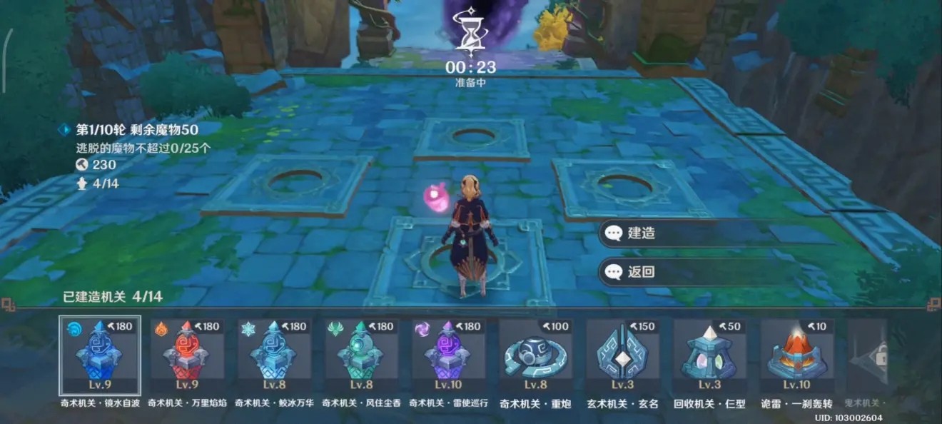 在这个点和后面挨着传送门的中心点放地雷,炸了就补上,并且这时候也不需要补建雷柱,攒着点数后面选玄术天赋用。