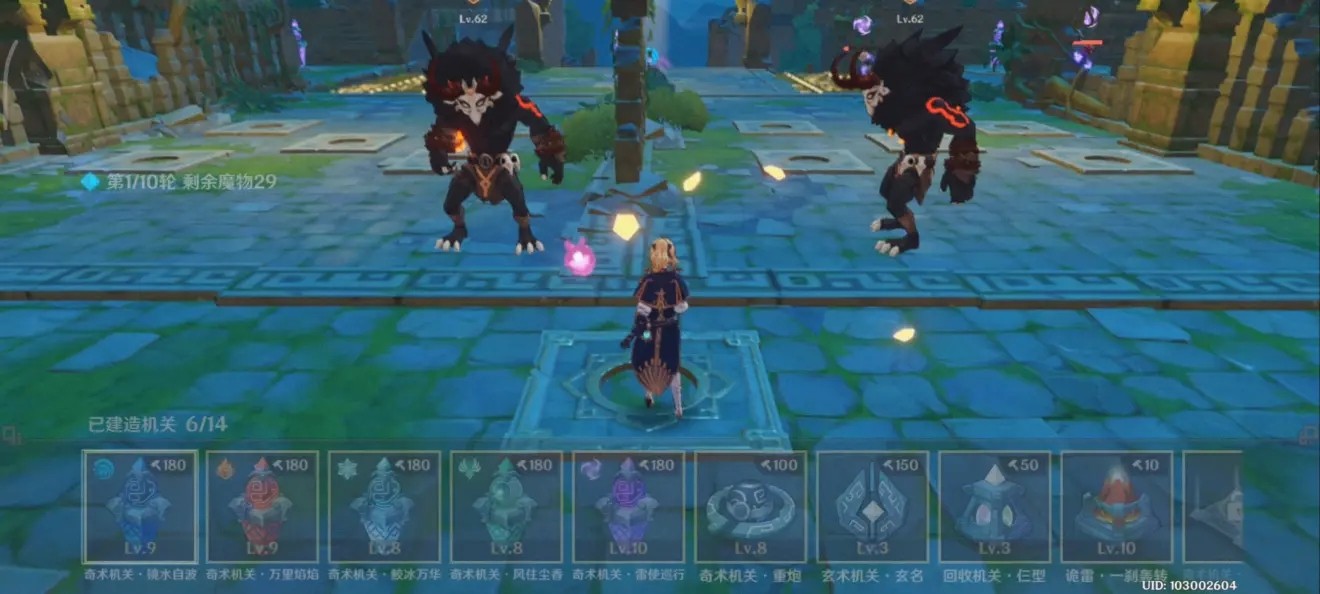 然后就是这个思路的开局打法了,第一关是最需要布局的,这里我们先在旁边和中间布置上3个雷柱和一个火柱,火柱的主要作用是为了破除丘丘人的盾。