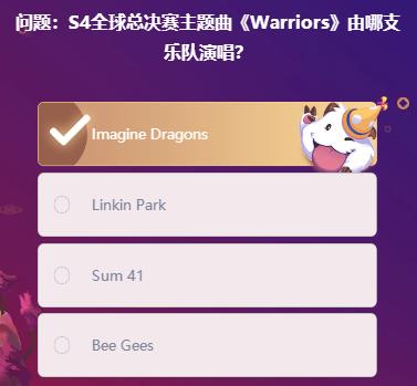 问题:S4全球总决赛主题曲《Warriors》由哪支乐队演唱? 答案:Imagine Dragons