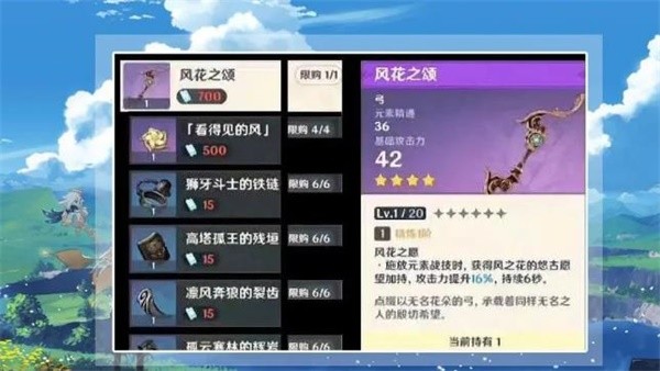 原神风花之颂是—款四星级的紫色弓箭,详细的情报如下: