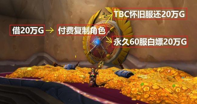比如某玩家决定购买复制角色服务,他身上只有一万金,然后从打算前往TBC服务器的朋友处借到20万金,复制角色后到TBC服务器将20万金归还,然后在60级服务器中“白嫖”到20万金币,之后将这些金币出售或者购买时光徽章,不但能“回本”还能狠狠赚上一笔。